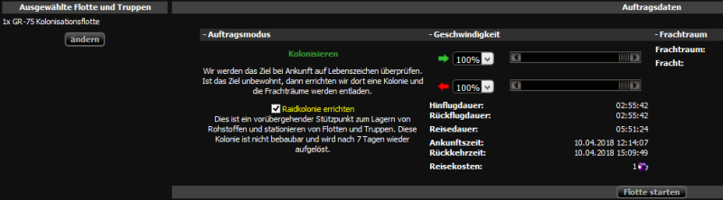 Eine Raidkolonie dient zum temporären Aufenthalt in einem entfernten System, um zum Beispiel einen Gegner schneller und effektiver angreifen zu können, ohne einen eigenen Standardplaneten dauernd verschieben zu müssen. Jedoch kann auf diesem Planeten KEIN Gebäude errichtet werden. Flotten können wie bei einem normalen Planeten stationiert werden. Um eine Raidkolonie zu errichten, müsst ihr im Flottenmenü nur die Raidkolo explizit auswählen.