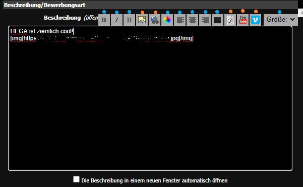 - Über die Symbole für Grafiken/Links lassen sich verschiedene Medien in die Beschreibung einpflegen. Die Symbole sind selbsterklärend. Youtubevideos oder eigene Grafiken, egal ob über einen Internetlink oder selbst hochgeladene Bilder, lassen sich so einfügen. Der Link muss zwischen den beiden Klammern stehen: [FUNKTION-A]LINK[/FUNKTION-A]!