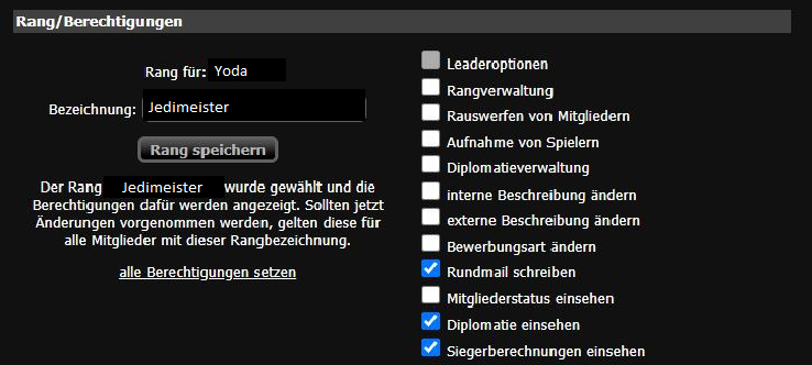 - Ebenfalls können freie Ränge erstellt und geändert werden. Hierfür stehen verschiedene Optionen für die Ränge (siehe Bild) zur Verfügung. Die Ränge sind nur intern zu sehen und können sich beispielsweise an Punkten orientieren. Hier sollte der Leader gut überlegen, welcher Spieler mit seinem Rang beispielsweise Ränge ändern, Rundmails schreiben, Onlinezeiten sehen oder die Beschreibung ändern darf.