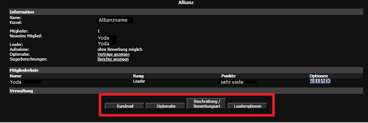 Vier Buttons stehen für den Leader und für die Berechtigten zur Verfügung: Rundmail, Diplomatie, Beschreibung / Bewerbungsart, Leaderoptionen. Die einzelnen Funktionen werden nun näher vorgestellt.