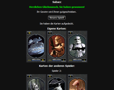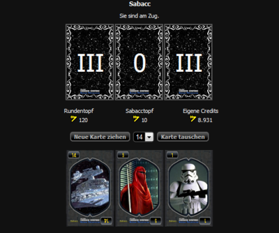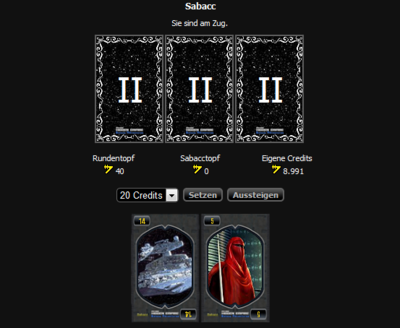 • Wenn man genau 23 erreicht, oder genau eine 0, eine 2 und eine 3 auf der Hand hat, bekommt man den Sabacctopf ausgezahlt.